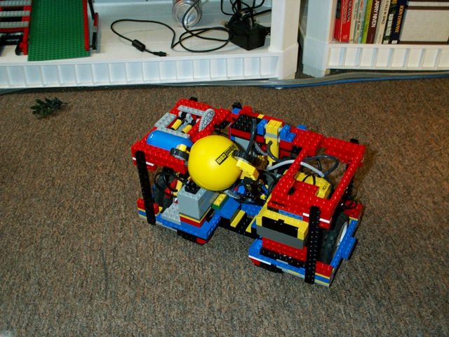 For balance, two casters are mounted at the back of the frame. Unfortunately, the center of gravity of the robot is almost directly over the drive wheels (despite the weight brick mounted on the back), causing it to tip forward briefly when it reverses.